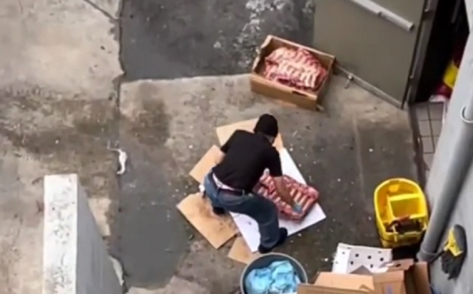 – írja a 24.hu. A férfi a koszos, cipőtől saras kartonon szétválasztott húsdarabokat egy kartondobozba dobta, amit valószínűleg bevittek a konyhába.