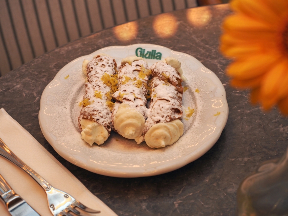Van egy citromos tart is, őrületes habbal a tetején, egy sós karamellás panna cotta, és egy fenomenális cannolo (pontosabban egyszerre három érkezik egy tányéron), tökéletes ropogós tésztával, krémes ricottával.