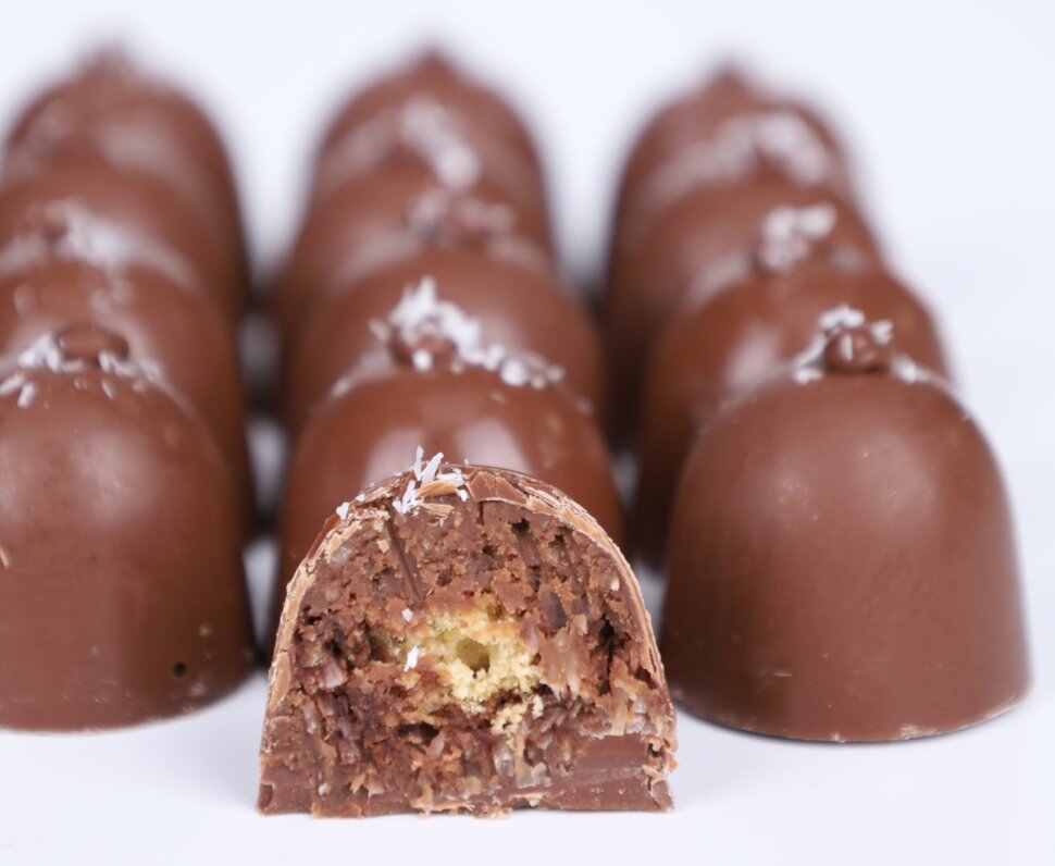Az egyik legizgalmasabb tétel azonban vitathatatlanul a kókuszkocka. Aty ragaszkodott hozzá, hogy a bonbon belsejében egy valódi, mini kókuszkocka rejtőzzön, amit kókuszreszelékes ganache ölel körbe.