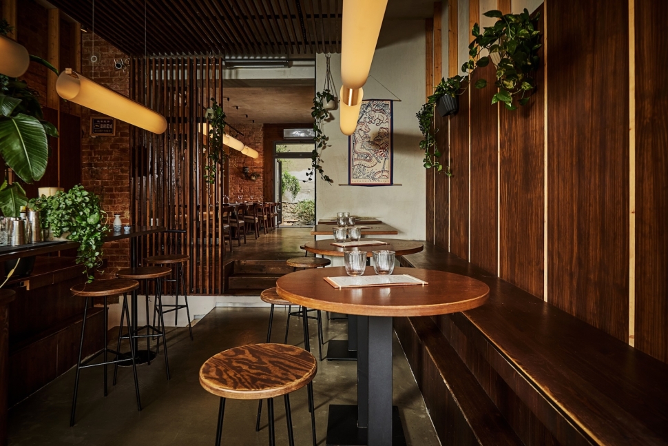 A hely letisztult fa burkolatokkal és minimalista dizájnnal rendelkezik, miközben a háttérben japán hip-hop adja a hangulatot.