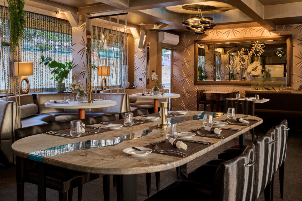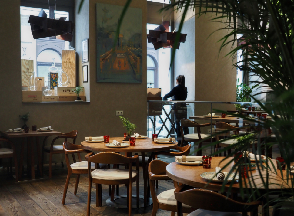 Az étterem belső tere elegáns, de közben igazán barátságos is: tele van növényekkel, és a falakon Barakonyi Zsombor kortárs festményei láthatók.
