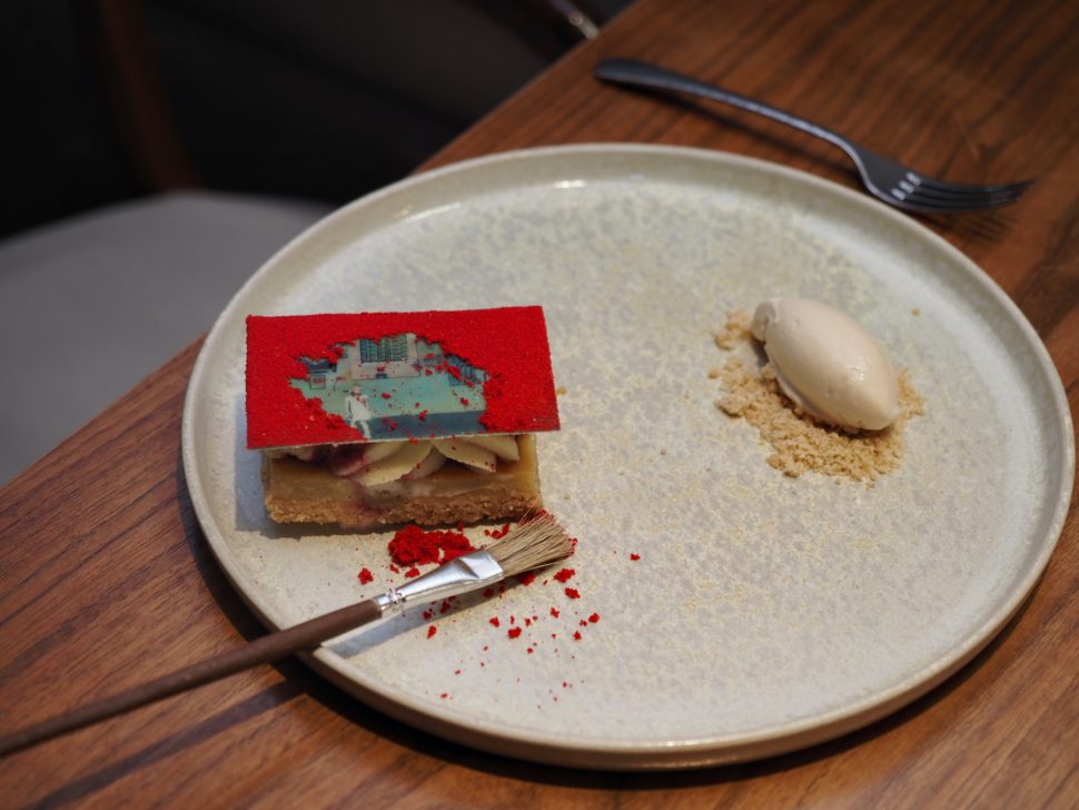Ha egyetlen példát emelünk csak ki az ebédmenüből, az legyen a Festmény a falon desszert. Ez a különleges édesség valóban az egyik falon található festményt idézi meg. A desszerthez kis ecsetet kapunk, amivel a tetejét fedő piros port seperhetjük le, és így jelenik meg a valódi mintázat. Ez a megoldás egyszerre izgalmas, interaktív és vizuálisan lenyűgöző, így a kulináris élmény valóban emlékezetessé válik.