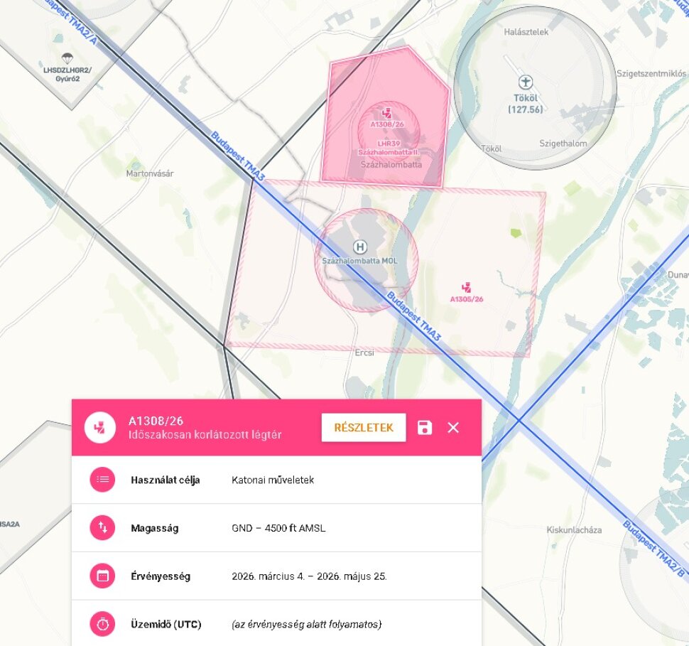 A Légiközlekedési Hatóság határozata alapján március 4-től május 25-ig teljes repülési tilalmat rendeltek el Százhalombatta, Paks és Albertirsa térségében.
