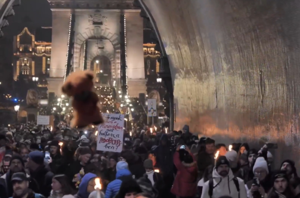 A Lánchíd pesti oldalán még most is nagy a tömeg, miközben Magyar Péterék már a Sándor Palota felé tartanak.